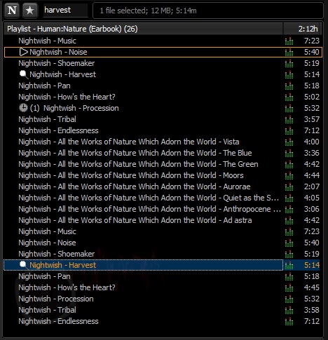 Die Suche in der Playlist funktioniert ähnlich wie die Schnellsuche in der Medienbibliothek - einfach das Suchfeld fokussieren (geht auch mit der Tastenkombination Strg+F, wenn die Playlist den Fokus hat) und lostippen. Beim Tippen werden alle Treffer mit einem Symbol markiert. Mit F3 werden die Treffer nach und nach ausgewählt und fokussiert. Ein Druck auf Enter spielt den aktuell fokussierten Titel ab. ESC löscht die Suche und alle Markierungen.