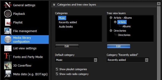 Sie können Ihren Wünschen entsprechend der Baumansicht weitere Ebenen hinzufügen. Wählen Sie dafür im Einstellungsdialog die "Konfiguration der Medienbibliothek". Klicken Sie dort auf den Button "Bearbeiten" unter der Anzeige der Ebenen in der Baumansicht.
