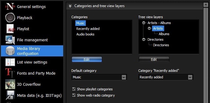 Besides the freely configurable categories, Nemp offers two categories for playlists and one for web radio. For playlists, a distinction is made between the normal playlists that are located somewhere in the directories of your music collection (mostly *.m3u or *.pls files) and the favorite playlists that are managed by Nemp. These have some additional features and are therefore treated separately (see section Favorite Playlists). These categories are not useful in all use cases, and can therefore be hidden. This also applies to the web radio category. Nemp does support web radio, but that is clearly not the focus of this program. If you do not use this feature, you can have this category hidden.