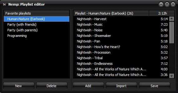 - If a playlist is deleted from favorites via the playlist editor, then the playlist file is not deleted immediately, but first renamed to *.npl.backup. This file can be renamed again if necessary to be able to import it again in a newly created favorites playlist.