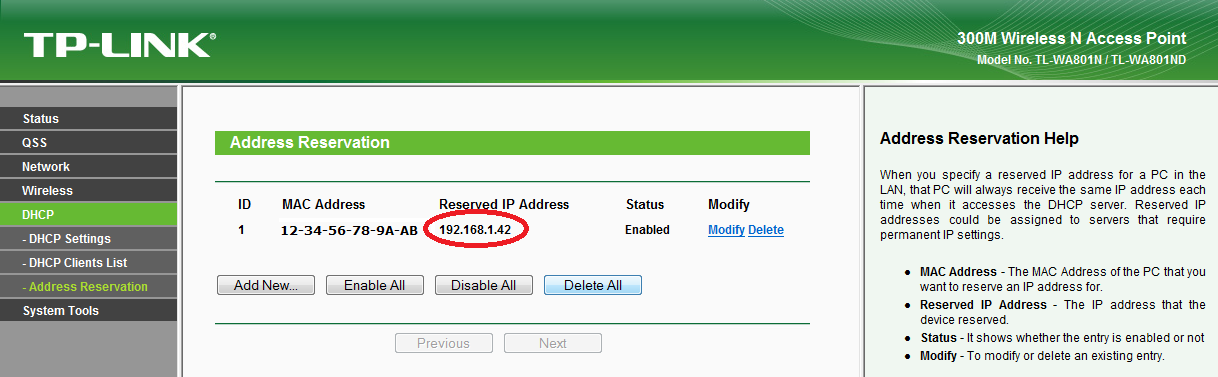 Within the address reservation of the access point, we assign a fixed IP address to this device. Every time the Nemp PC is connected to this access point, it will have the same IP address (here 192.168.1.42).