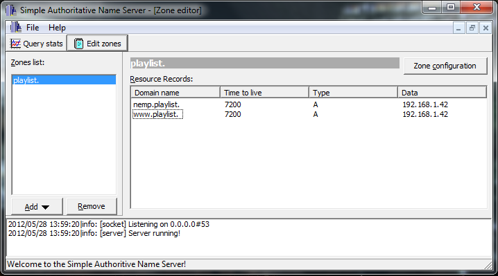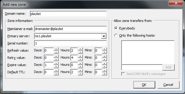 After downloading and installing Sans, we setup a new primary zone (Add -> New primary zone). We want a address like "www.playlist", so we need a zone called "playlist".
