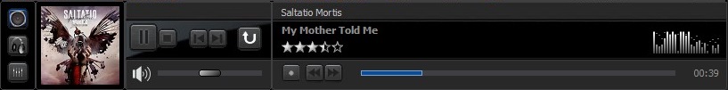 Der breite Teil rechts zeigt einige Infos zum aktuellen Titel - Interpret, Titel, Sternchen-Bewertung sowie die Fortschrittsanzeige. Außerdem Buttons zur Aufnahme (nur bei Webradio) sowie zum Vor- und Zurückspringen innerhalb des aktuellen Titels (nur bei Dateien).