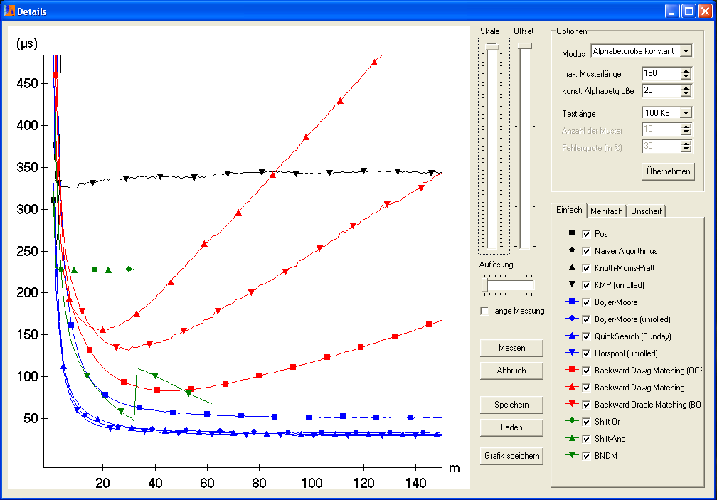 Das Animationsprogramm führt einige ausgewählte einfache Algorithmen parallel aus und animiert den Suchvorgang. Das andere misst die Laufzeiten sämtlicher Algorithmen für verschiedene Musterlängen und Alphabetgrößen und bereitet die Ergebnisse grafisch auf.