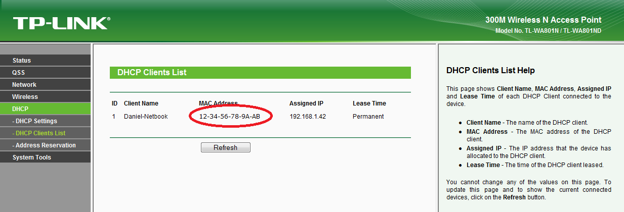 Next we activate the WiFi, and connect the PC with it, where Nemp should be running on later. Refresh the DHCP client list on your access point and copy the MAC address of your PC.