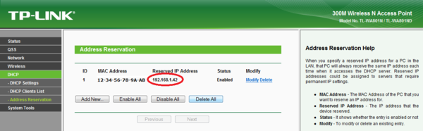 In der Adress-Reservierung des Router-Menüs erstellen Sie dann einen neuen Eintrag mit dieser Mac-Adresse und weisen sie diesem Computer eine feste IP-Adresse zu. Damit ist dieser Computer immer über eine feste IP-Adresse im Netzwerk erreichbar.